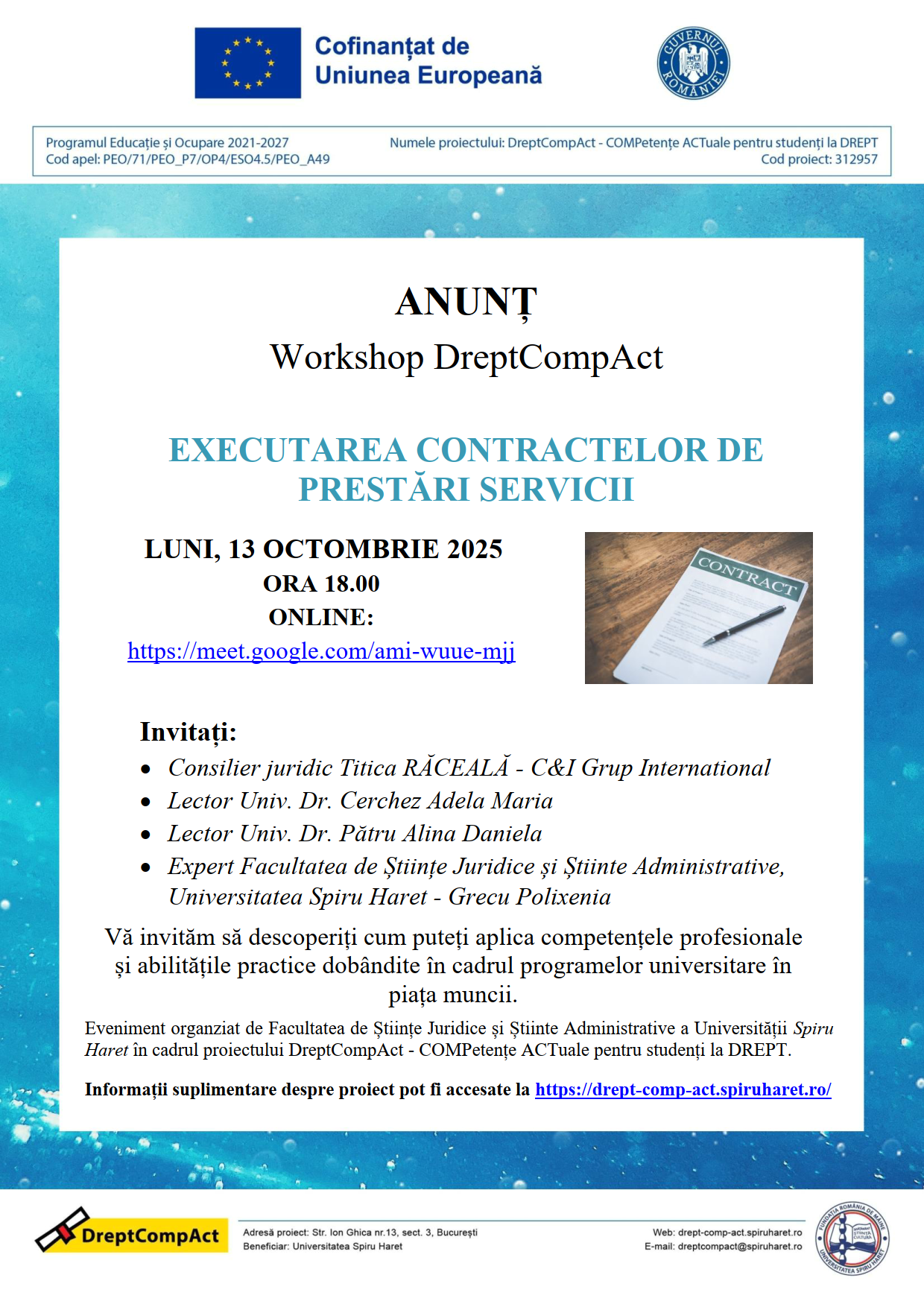 Luni, 13 octombrie 2025, va avea loc un nou workshop online organizat în cadrul proiectului DreptCompAct, dedicat facilitării comunicării dintre mediul academic și mediul economic real. Eveniemntul este adresat studentilor de la Facultatea de Științe Juridice și Științe Administrative – Universitatea Spiru Haret care sunt înscriși în proiect dar și celor care doresc să afle informații suplimentare despre executarea contractelor de prestări servicii.