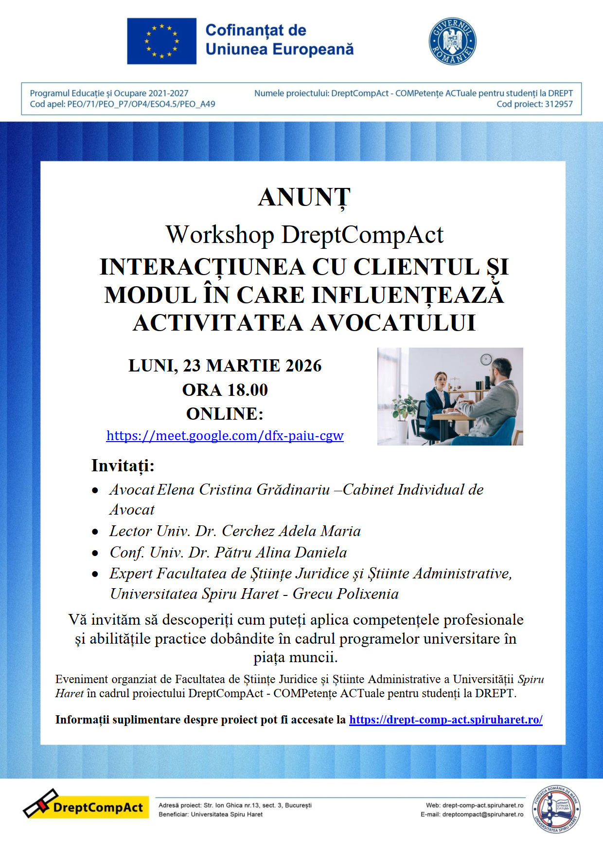 Luni, 23 martie 2026, începând cu ora 18:00, Facultatea de Științe Juridice și Științe Administrative din cadrul Universității Spiru Haret organizează un nou workshop din seria DreptCompAct, dedicat studenților interesați de dezvoltarea competențelor practice necesare în profesia juridică. Tema întâlnirii – „Interacțiunea cu clientul și modul în care influențează activitatea avocatului” – aduce în prim-plan una dintre cele mai importante dimensiuni ale practicii juridice contemporane.