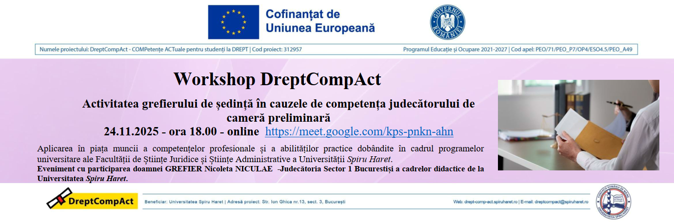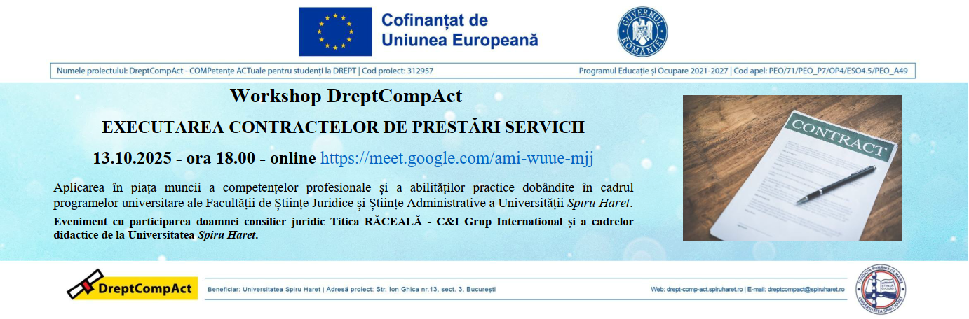 - PARTICULARITĂȚI ȘI PROVOCĂRI ÎN ACTIVITATEA CONSILIERULUI JURIDIC , Workshop online, 15.04.2025, ora. 18.00
