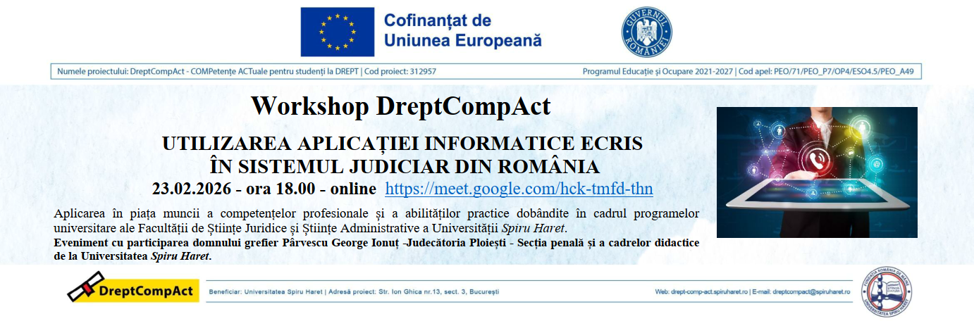 - ATRIBUȚIILE PERSONALULUI AUXILIAR DE SPECIALITATE ÎN CADRUL STRUCTURILOR DE PARCHET CU COMPETENȚĂ AUTONOMĂ/EXCLUSIVĂ – workshop online 8.07.2025, ora. 18.00