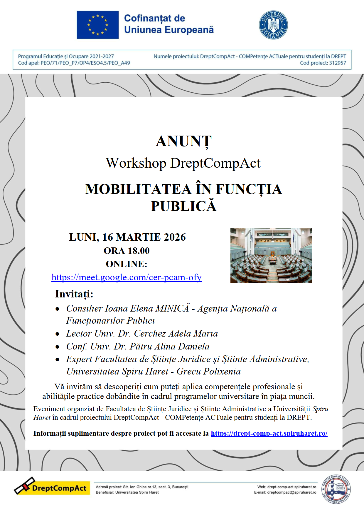 Luni, 16 martie 2026, începând cu ora 18:00, va avea loc online un nou workshop organizat în cadrul proiectului DreptCompAct, dedicat unei teme de actualitate pentru sistemul administrativ: mobilitatea în funcția publică. Evenimentul își propune să aducă în atenția participanților cadrul juridic și implicațiile practice ale mobilității funcționarilor publici, un mecanism esențial pentru eficientizarea și modernizarea administrației publice.