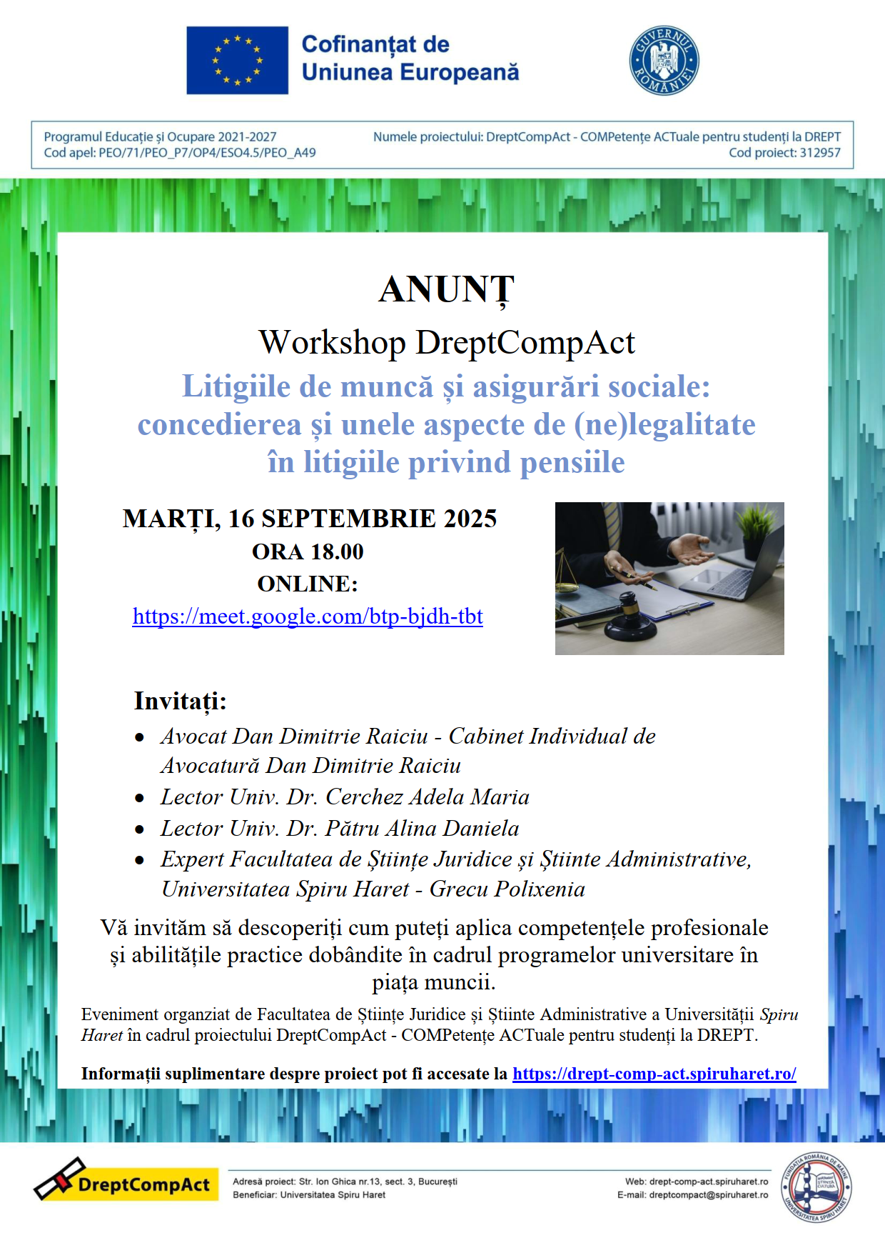 Marți, 16 septembrie 2025, va avea loc un workshop organizat în cadrul proiectului DreptCompAct, dedicat facilitării comunicării dintre mediul academic și mediul economic real. Evenimentul aduce împreună studenți și cadre didactice de la Facultatea de Științe Juridice și Științe Administrative – Universitatea Spiru Haret, alături de un invitat din practica juridică, pentru a discuta o temă de actualitate: litigiile de muncă și asigurări sociale.
