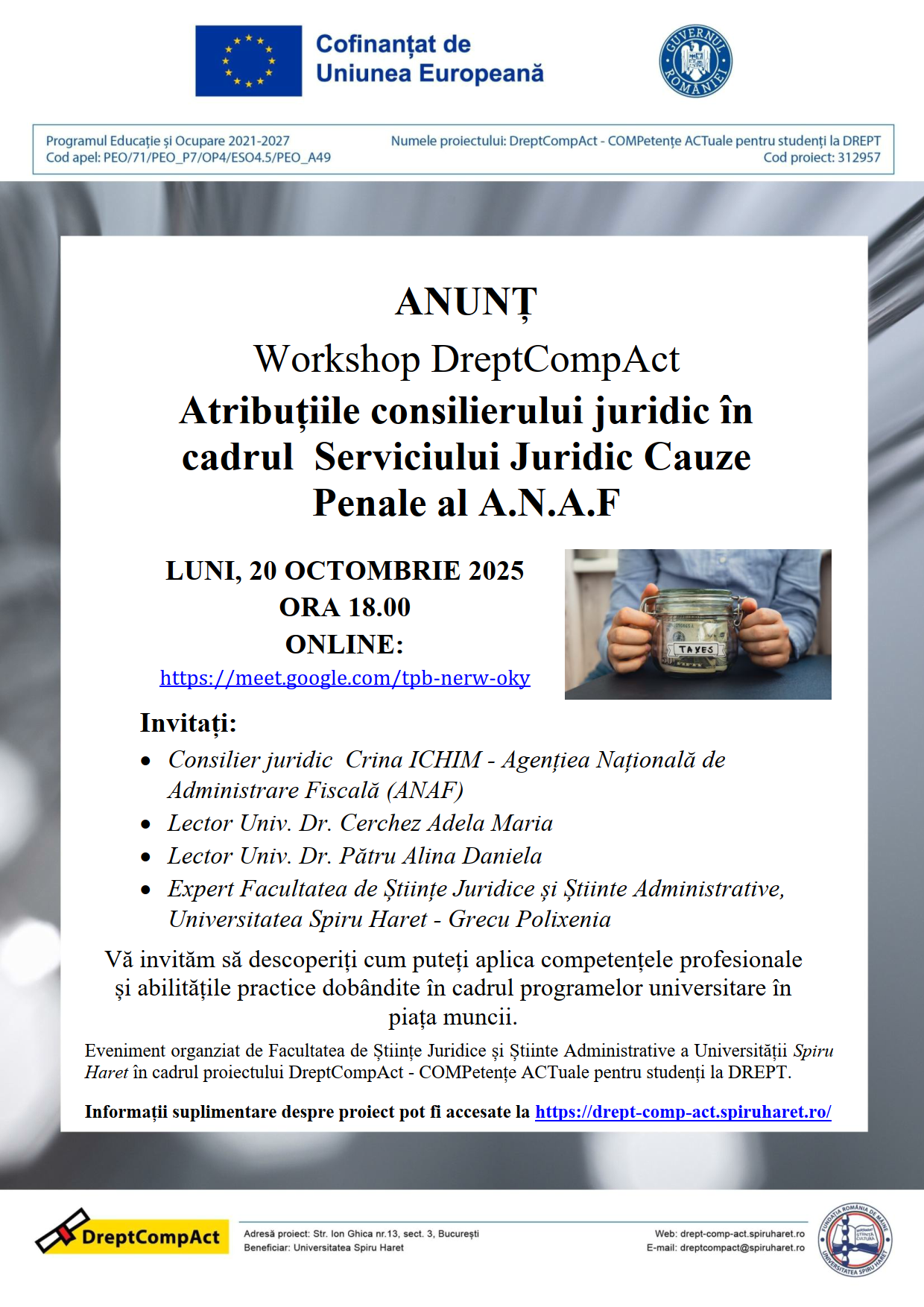 Luni, 20 octombrie 2025, începând cu ora 18:00, studenții Facultății de Științe Juridice și Științe Administrative din cadrul Universității Spiru Haret sunt așteptați online, alături de doamna Consilier juridic Crina ICHIM de la Direcția Generală Juridică din cadrul Agenției Naționale de Administrare Fiscală. Evenimentul face parte din activitatea A.2.1 a proiectului DreptCompAct, care vizează facilitarea comunicării între mediul academic și mediul economic real, în vederea corelării competențelor și abilităților practice oferite de programele de licență și masterat cu cerințele unei piețe a muncii dinamice și globale.