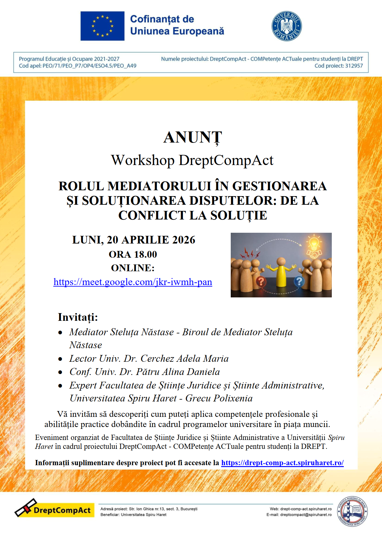 Luni, 20 aprilie 2026, începând cu ora 18:00, va avea loc online un nou workshop organizat în cadrul proiectului DreptCompAct, dedicat unui domeniu esențial pentru soluționarea amiabilă a conflictelor – un proces care pune accent pe dialog, echilibru și identificarea unor soluții reciproc avantajoase, înainte de a apela la instanța de judecată.