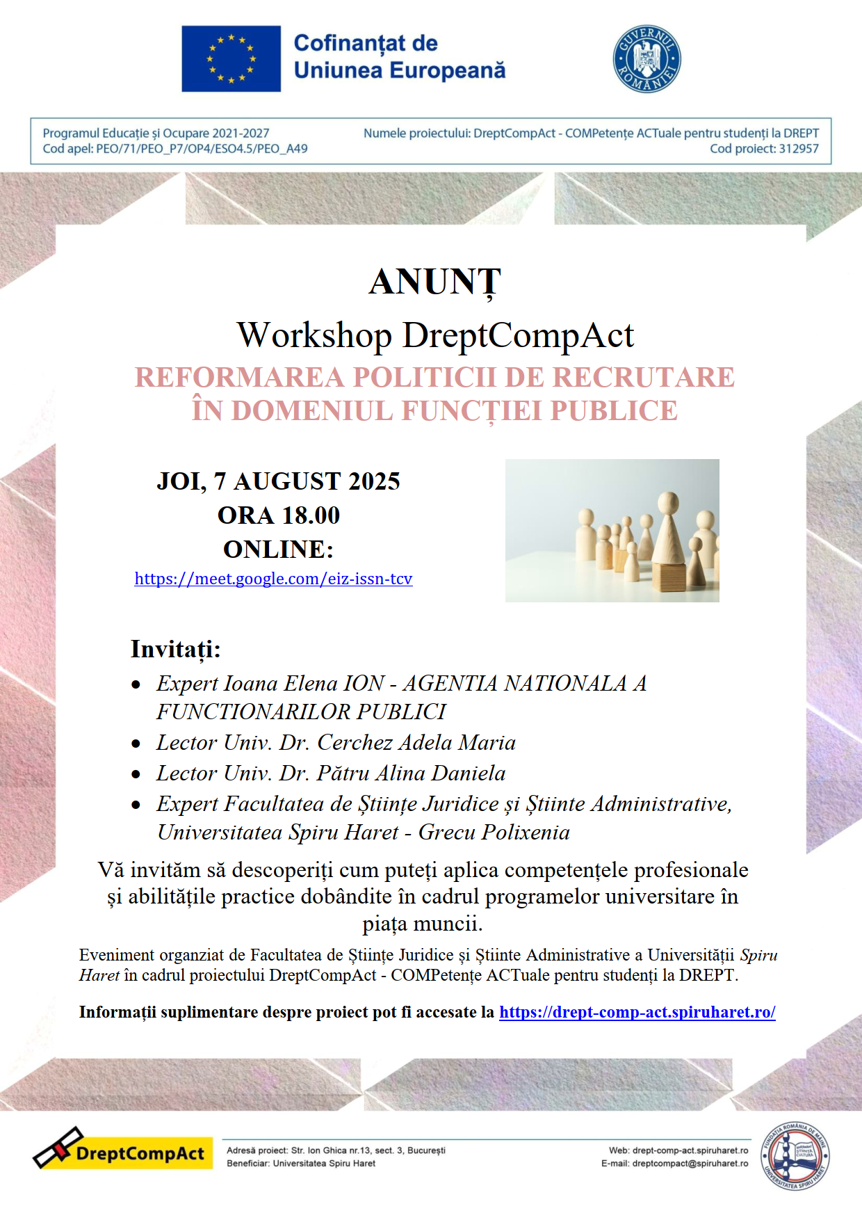 - Workshop DreptCompAct: Dualismul profesiei de consilier juridic în sistemul de apărare, ordine publică și securitate națională - workshop online 22.07.2025, ora. 18.00
