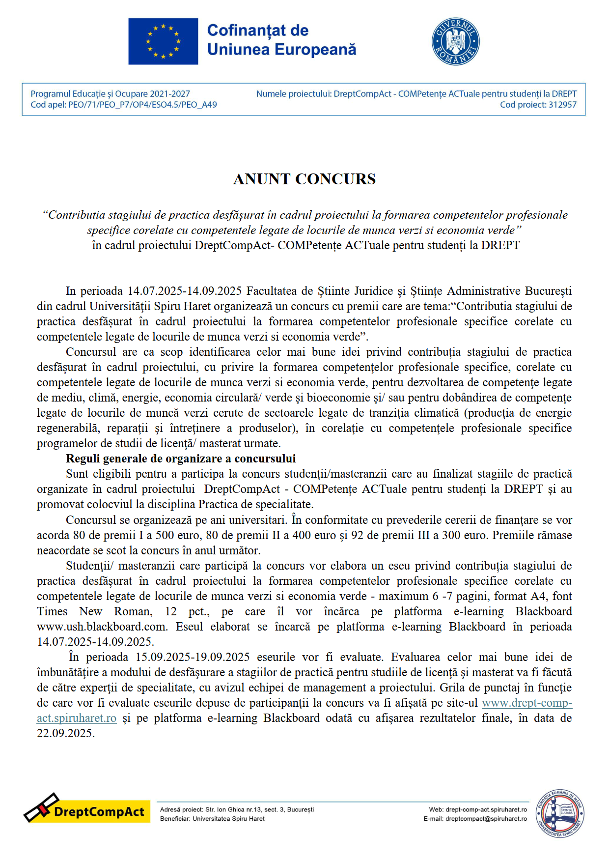 Luni, 13 octombrie 2025, va avea loc un nou workshop online organizat în cadrul proiectului DreptCompAct, dedicat facilitării comunicării dintre mediul academic și mediul economic real. Eveniemntul este adresat studentilor de la Facultatea de Științe Juridice și Științe Administrative – Universitatea Spiru Haret care sunt înscriși în proiect dar și celor care doresc să afle informații suplimentare despre executarea contractelor de prestări servicii.