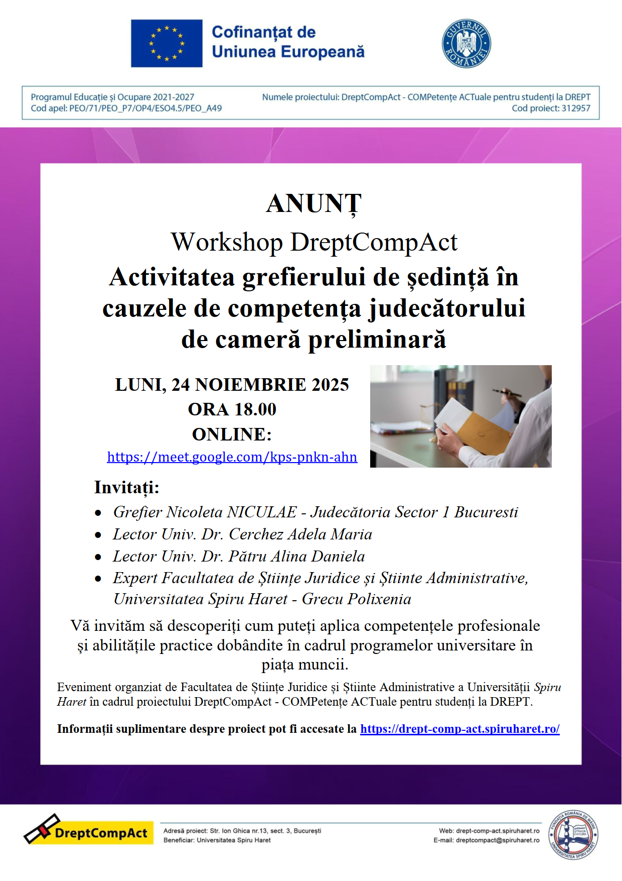 Luni, 24 noiembrie 2025, începând cu ora 18:00, studenții Facultății de Științe Juridice și Științe Administrative din cadrul Universității Spiru Haret sunt invitați să participe online la un nou workshop din seria DreptCompAct. Evenimentul o are ca invitată pe doamna grefier Nicoleta NICULAE, reprezentant al Judecătoriei Sectorului 1 București, care va aborda o temă de mare actualitate și importanță practică: activitatea grefierului de ședință în cauzele de competența judecătorului de cameră preliminară.