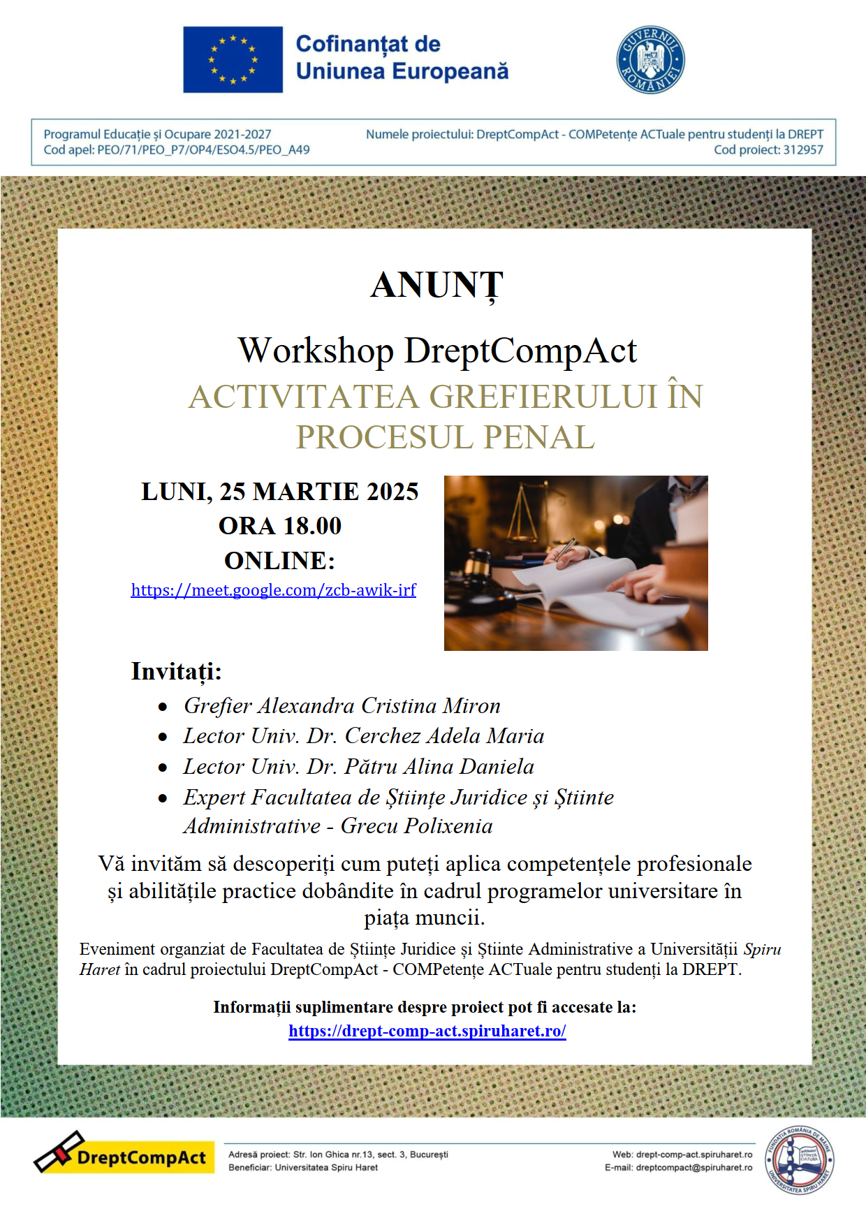 Marți, 25 martie 2025, începând cu ora 18:00, Facultatea de Științe Juridice și Științe Administrative a Universității Spiru Haret organizează în cadrul proiectului DreptCompAct un workshop online cu tema „Activitatea Grefierului în Procesul Penal”. Acesta are loc în cadrul activității A.2.1 Dezvoltarea si sprijinirea parteneriatelor sustenabile, cu angajatori din mediul economic real, la care se realizeaza stagiile de practică de specialitate, pentru adaptarea și corelarea competențelor profesionale cu cerințele pieței muncii, în vederea facilitării inserției socio-profesionale a viitorilor absolvenți.