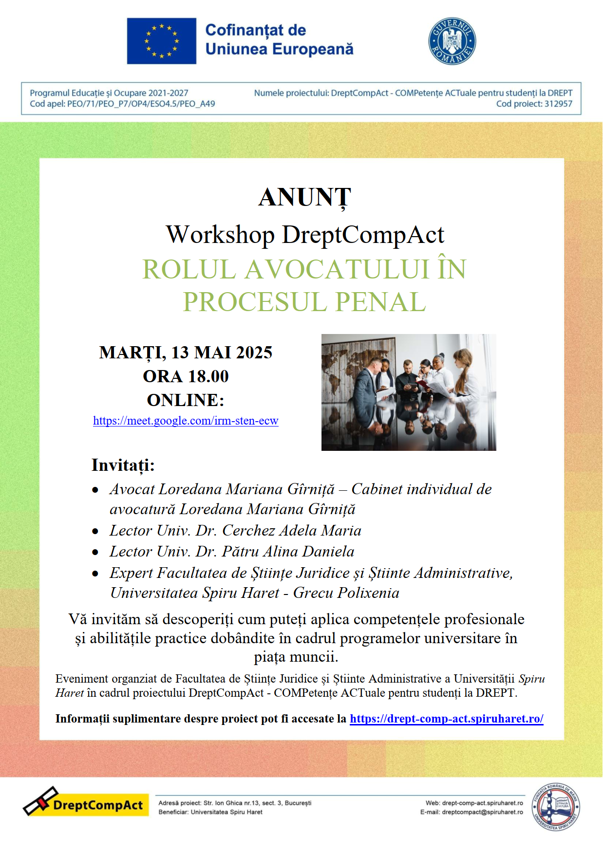 Într-un context economic și juridic în continuă schimbare, în care piața muncii impune exigențe tot mai ridicate, adaptarea pregătirii universitare la realitățile profesionale devine o necesitate, nu doar o opțiune. Pornind de la această premisă, Facultatea de Științe Juridice și Știinte Administrative a Universității Spiru Haret organizează un workshop cu tema „Rolul Avocatului în Procesul Penal”, un eveniment online realizat în cadrul proiectului DreptCompAct conceput pentru a crea o legătură funcțională între mediul academic și mediul economic real.