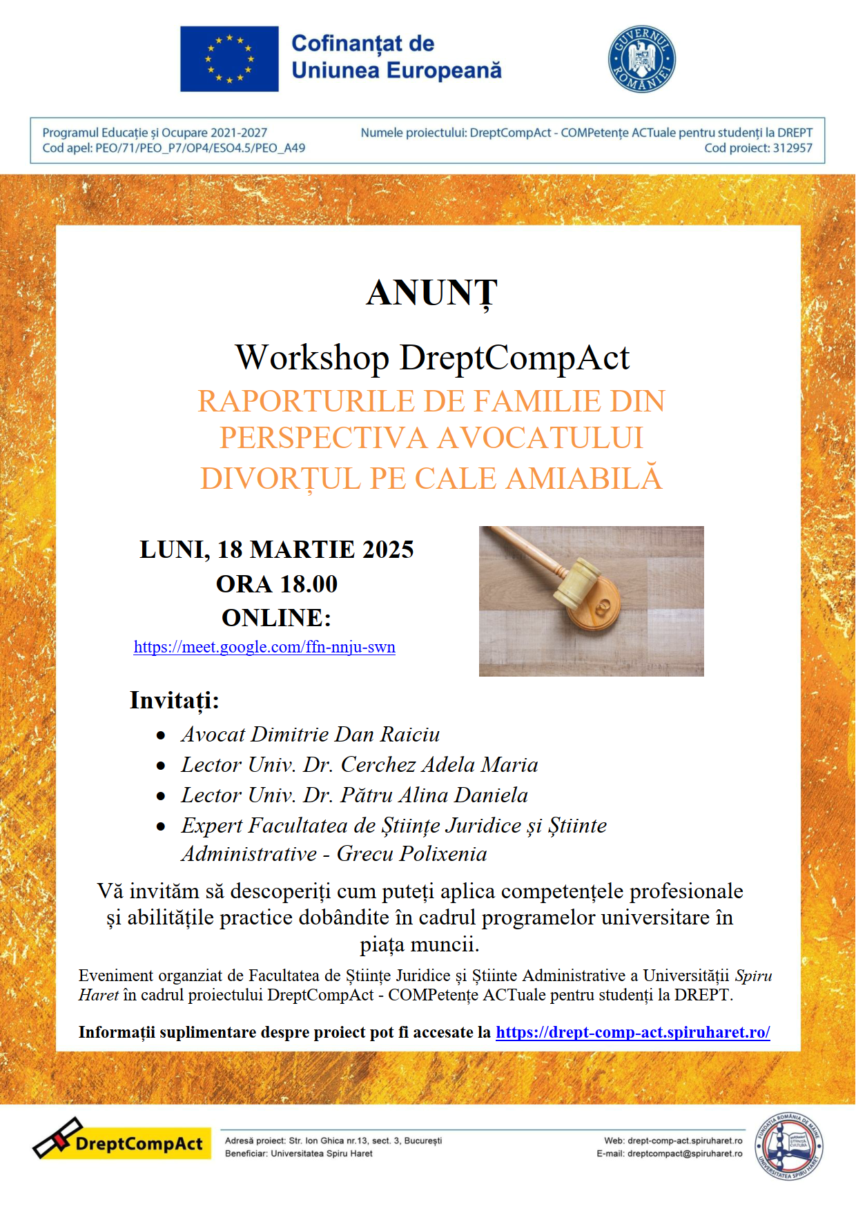 Detali despre eveniment găsiți pe https://drept-comp-act.spiruharet.ro/index.php/workshop-uri/workshop-uri-cu-mediul-economic