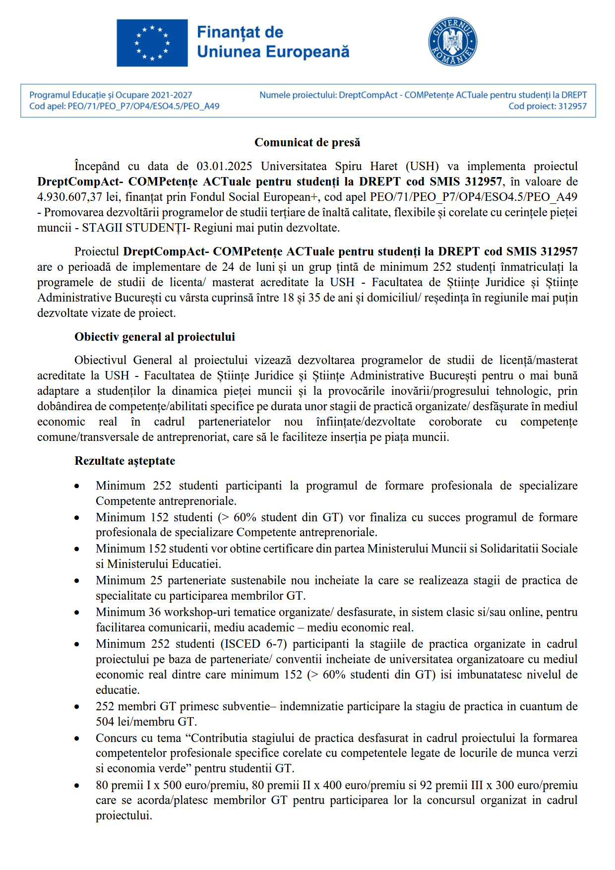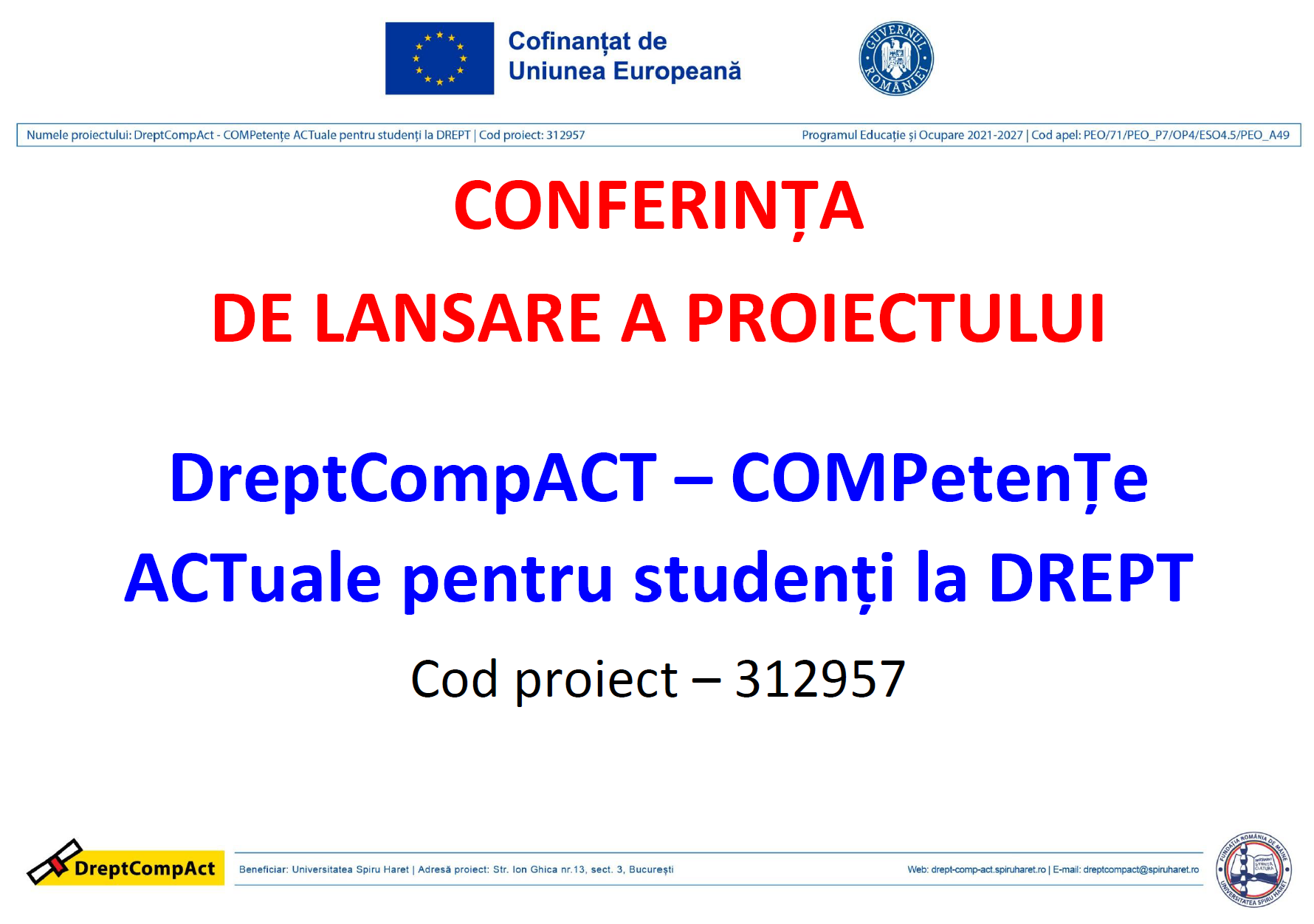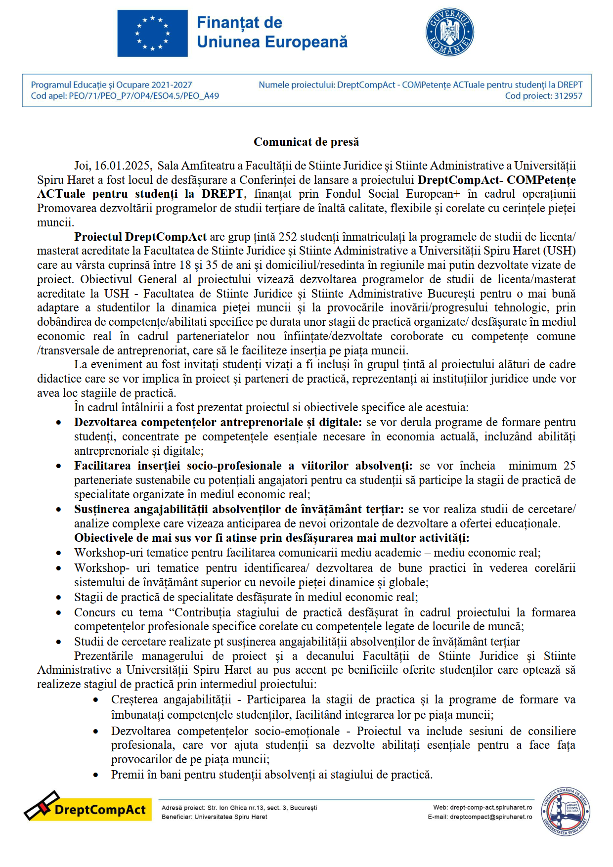 Joi, 16 ianuarie 2025, ora 17.00 în Sala Amfiteatru a Facultății de Științe Juridice și Științe Administrative a Universității Spiru Haret (USH) se va desfășura Conferința de lansare a proiectului de practica DreptCompACT