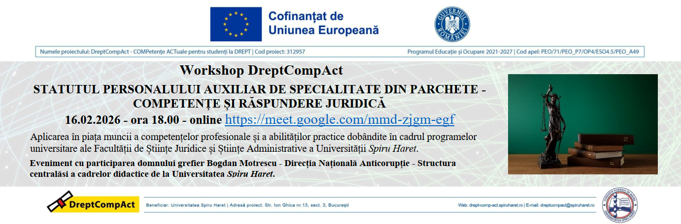- ATRIBUȚIILE PERSONALULUI AUXILIAR DE SPECIALITATE ÎN CADRUL STRUCTURILOR DE PARCHET CU COMPETENȚĂ AUTONOMĂ/EXCLUSIVĂ – workshop online 8.07.2025, ora. 18.00
